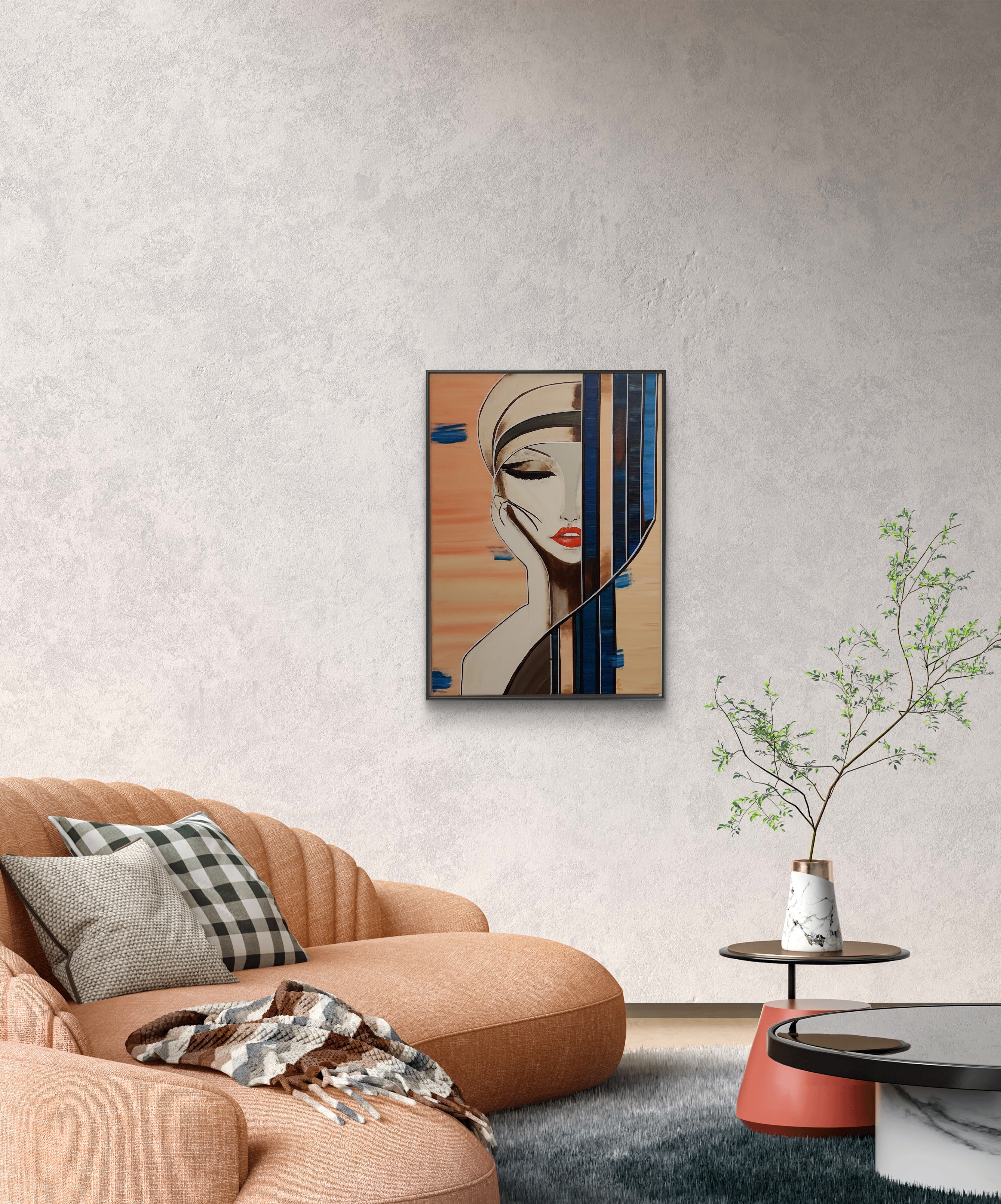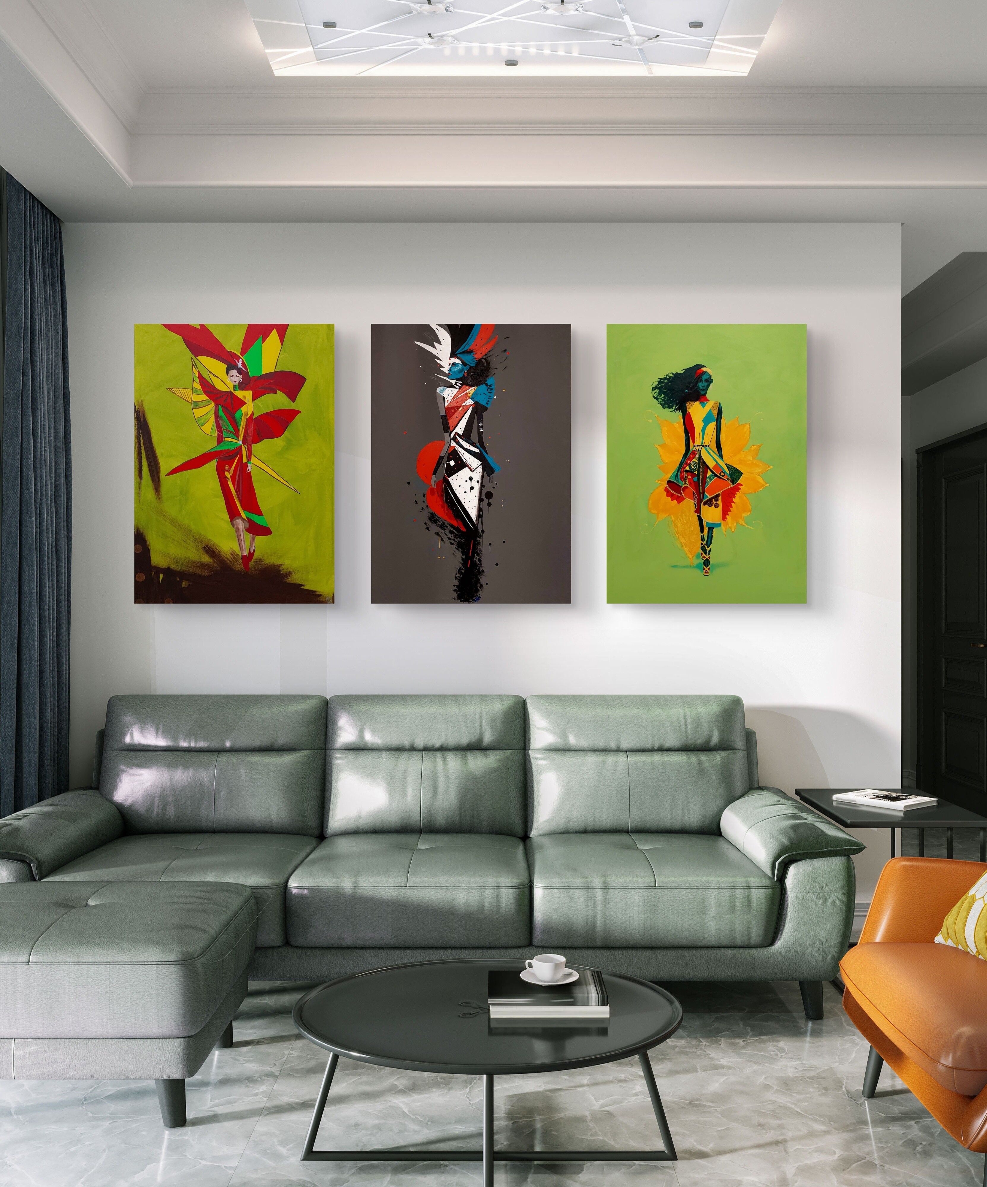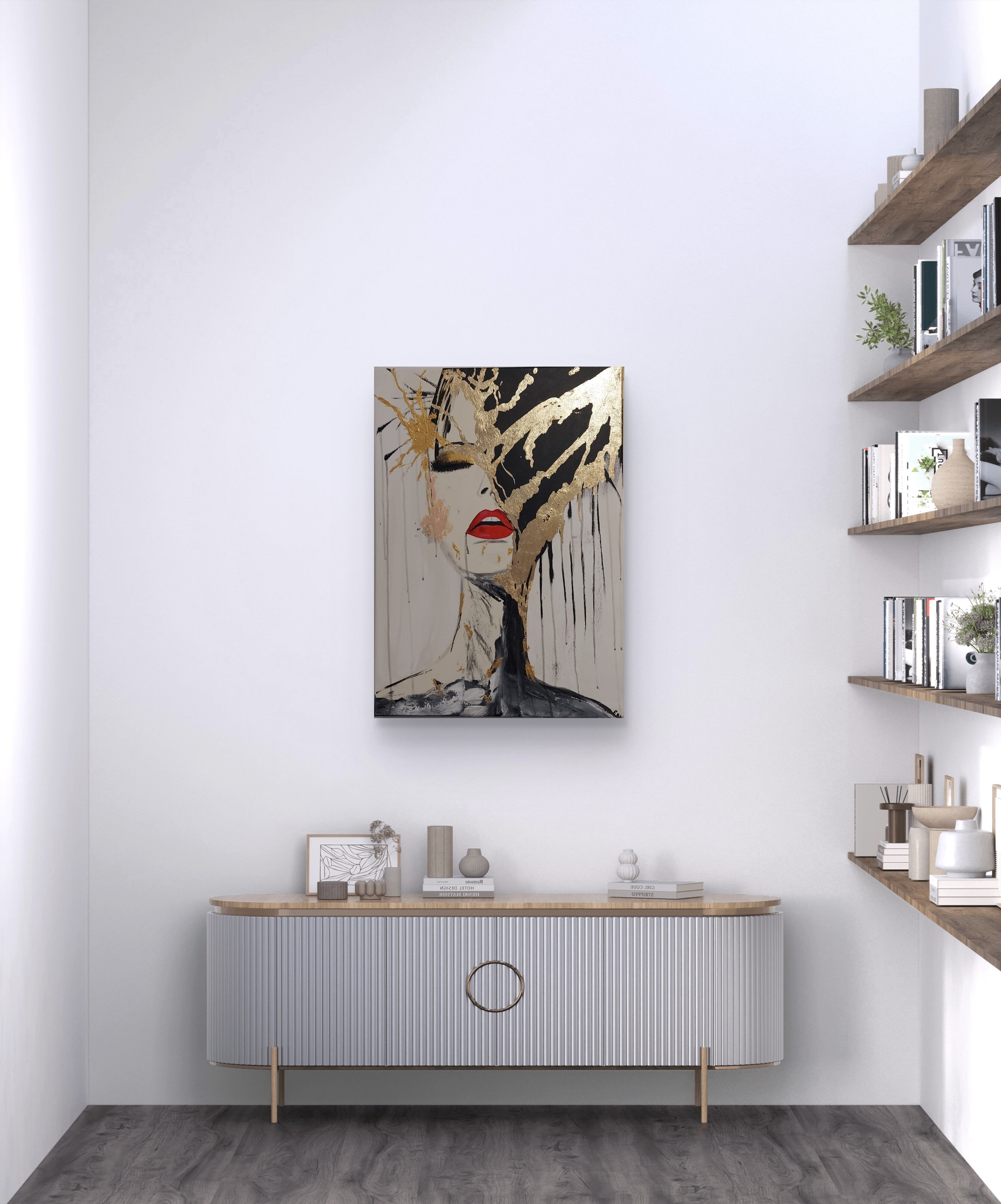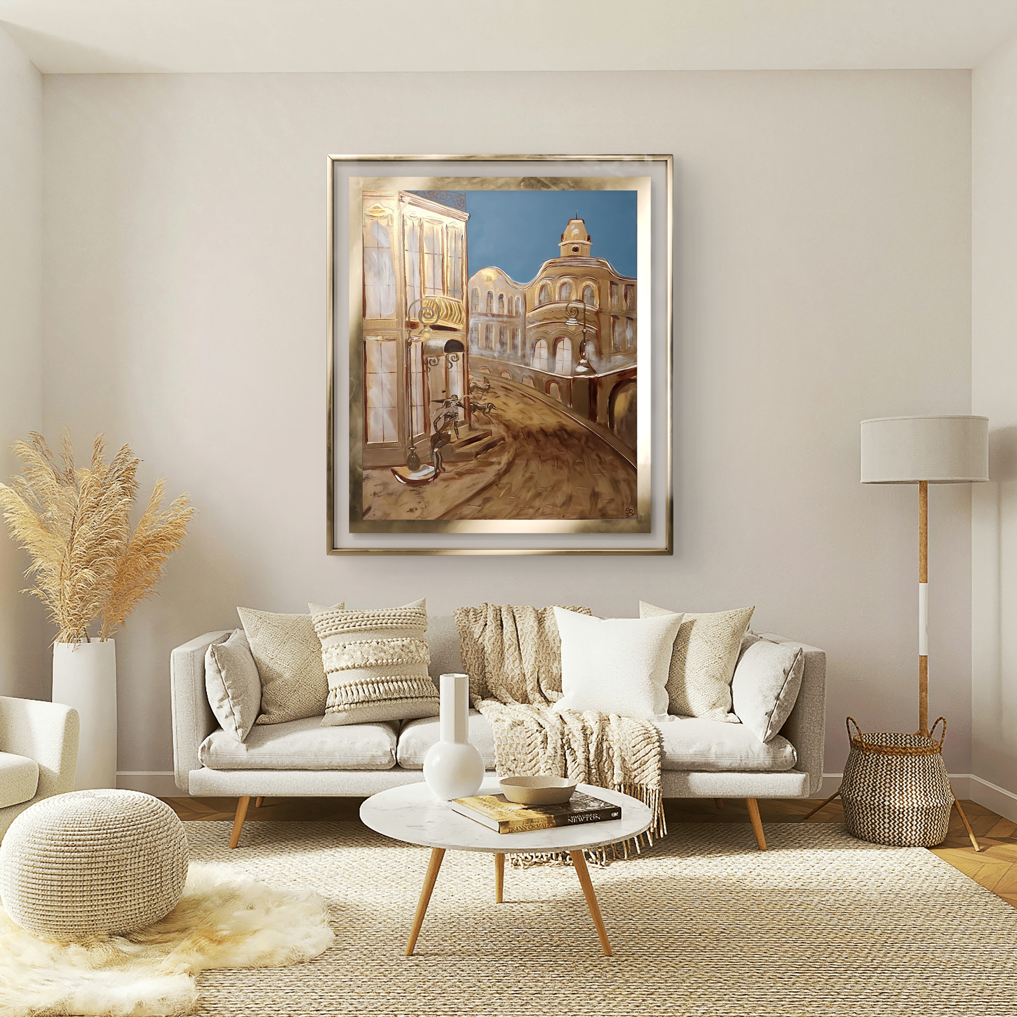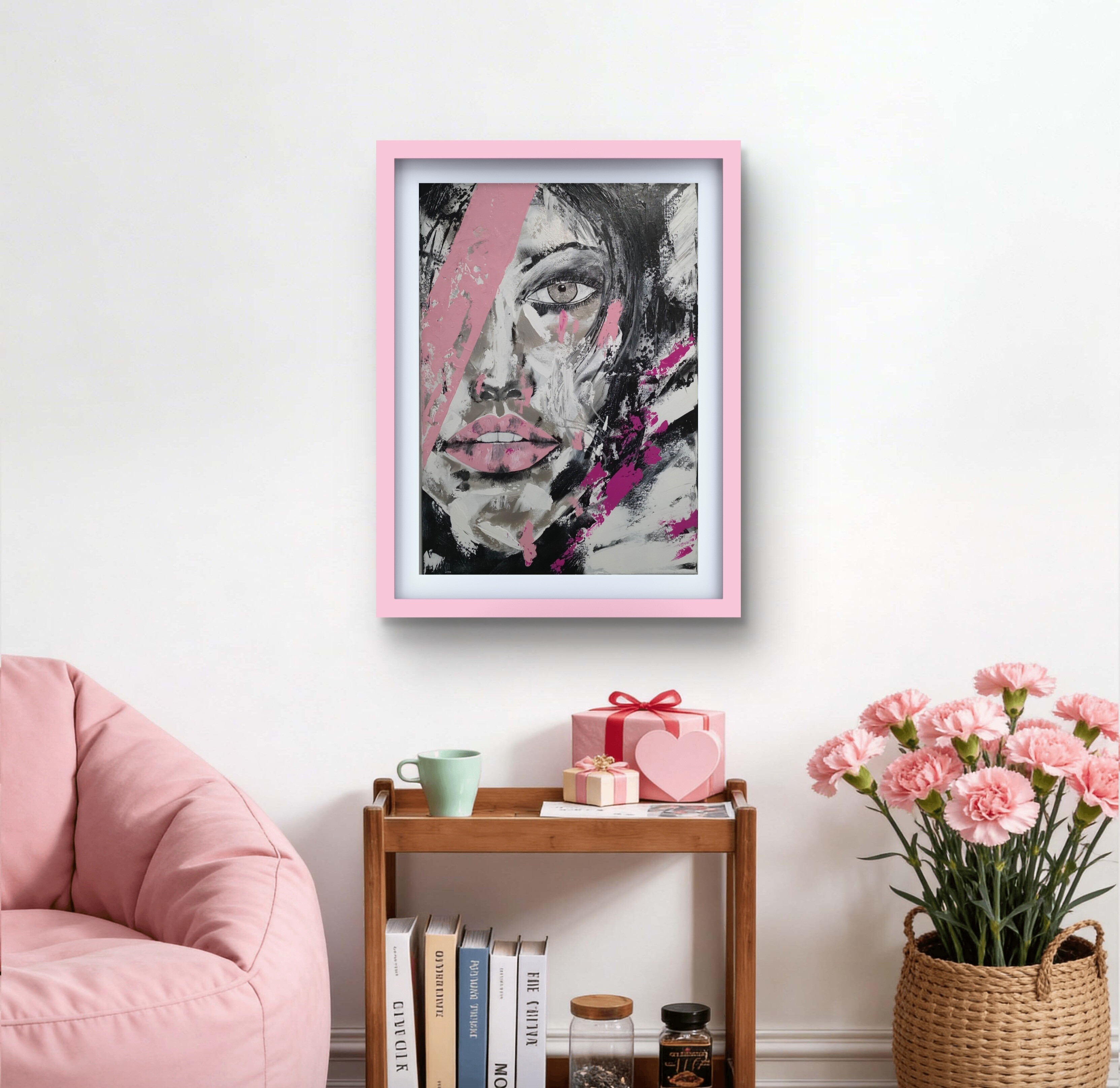 Wizualizacja obrazów w nowoczesnym wnętrzu w oprawie bądź bez.