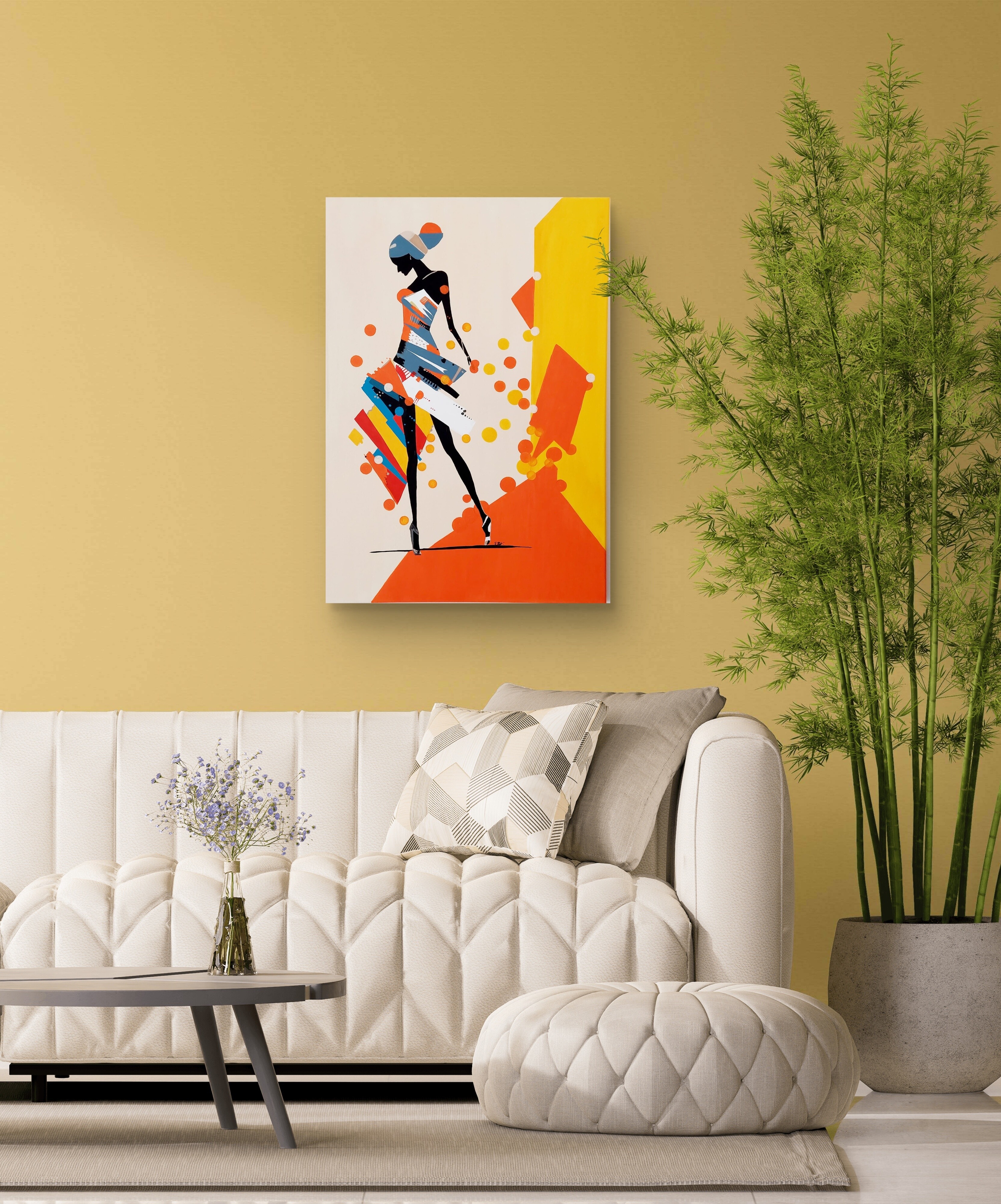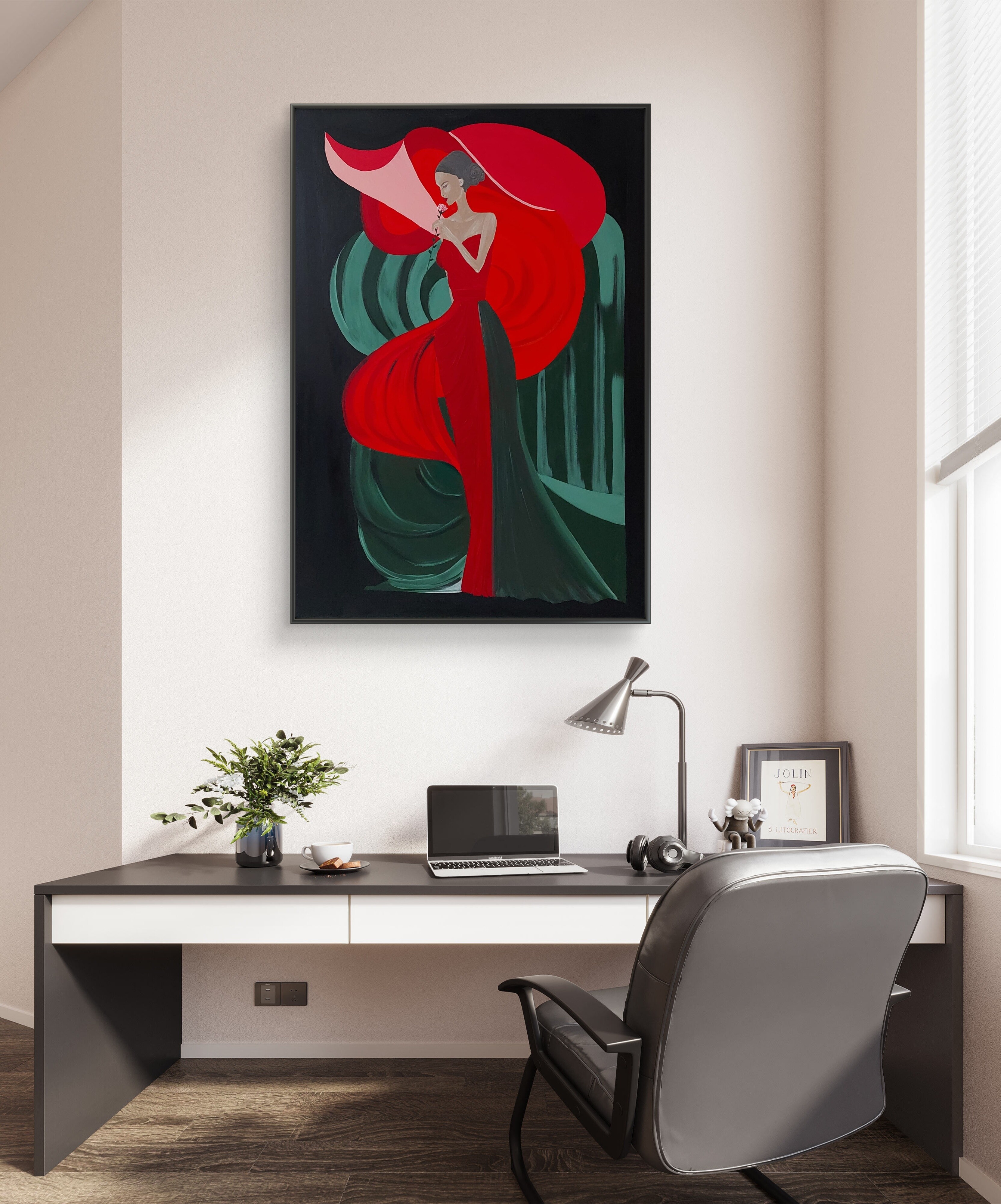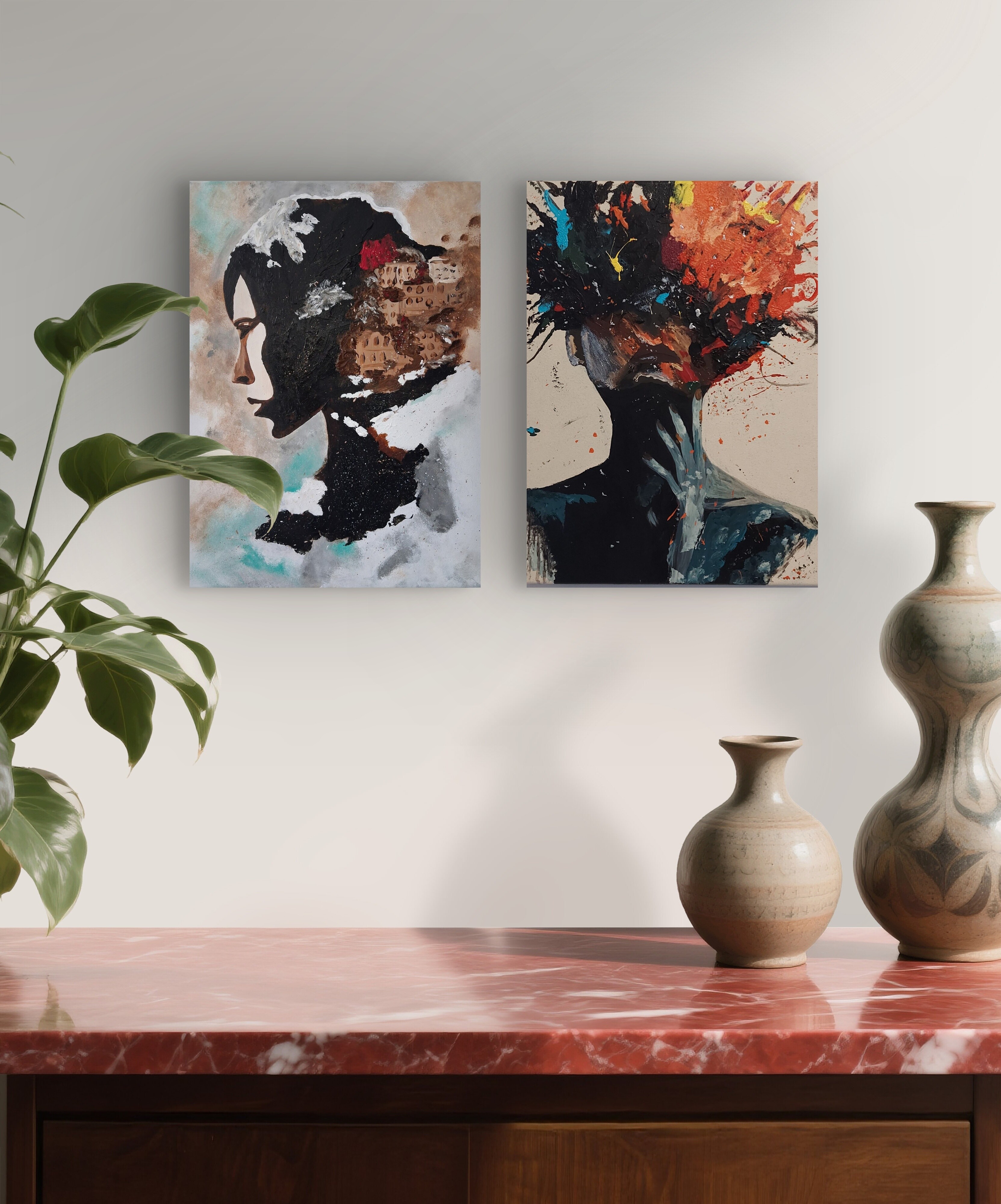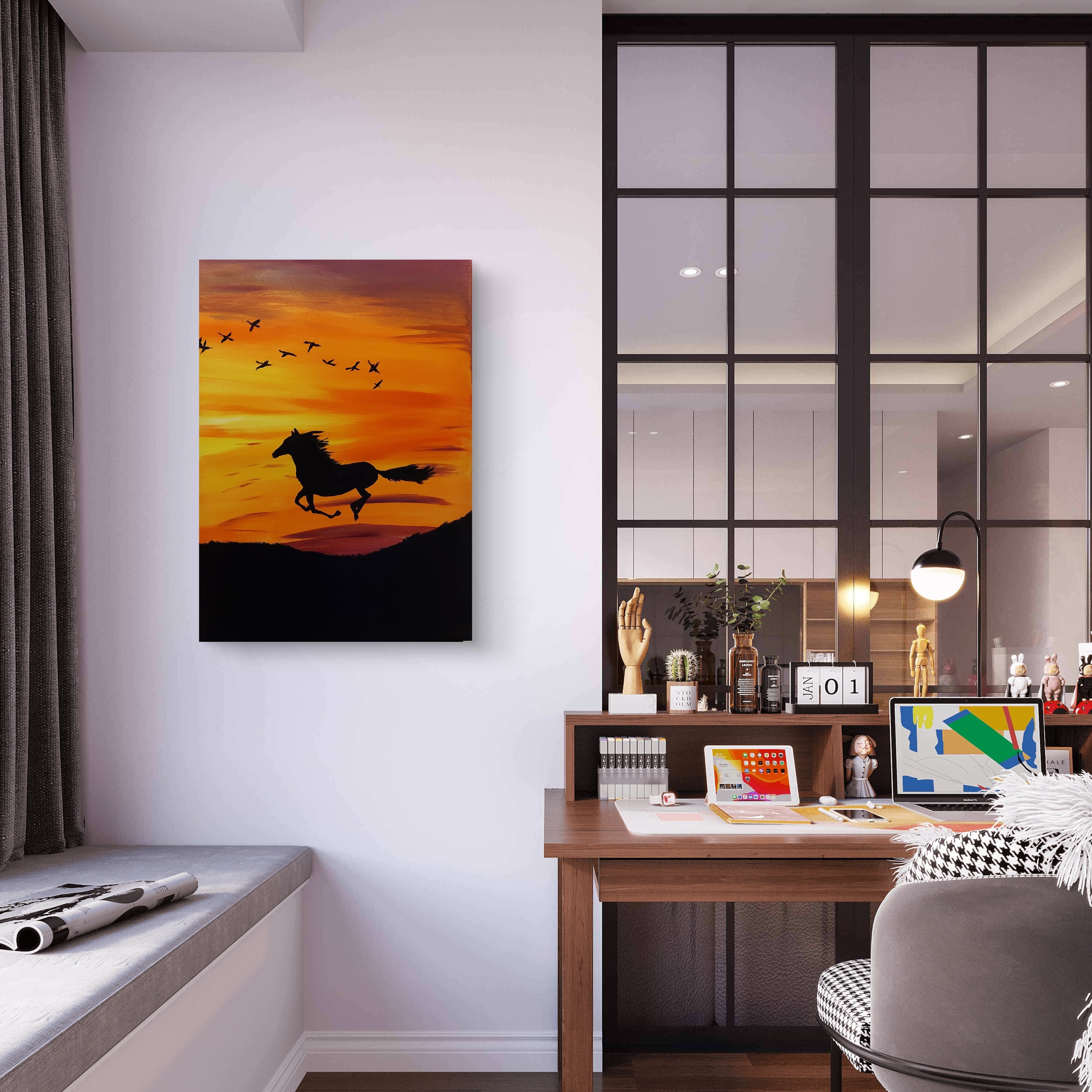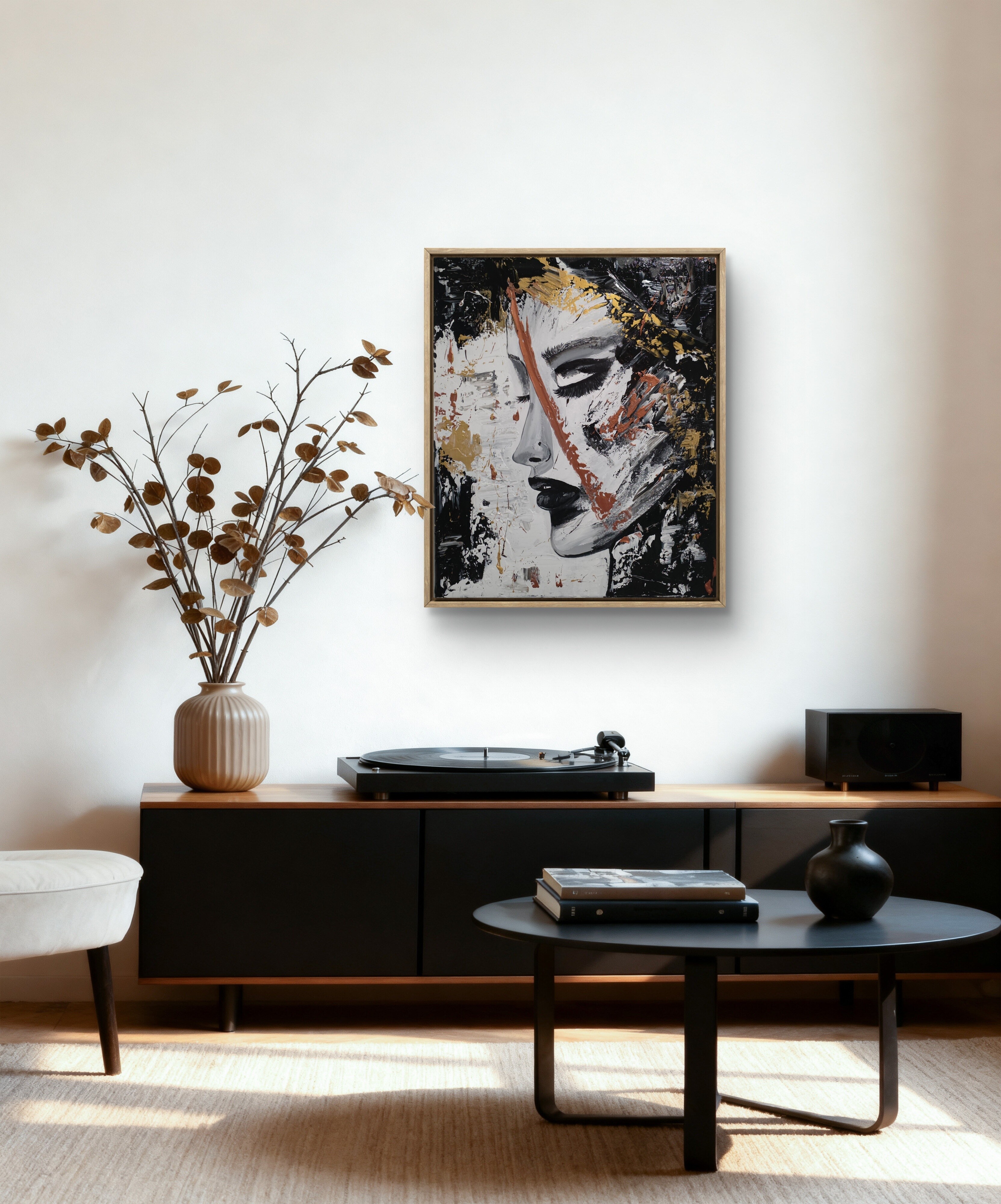 Wizualizacja obrazów w nowoczesnym wnętrzu w oprawie bądź bez.